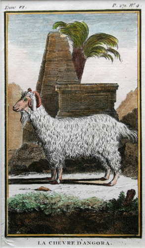 Originaire des contreforts de l’Himalaya, la chèvre angora fut amenée en Asie mineure par les peuplades turkmènes lors de leur lente migration vers l’ouest, particulièrement dans la région d’Ankara (anciennement Angora), dans l’actuelle Turquie, d’où le nom de « chèvre angora ».